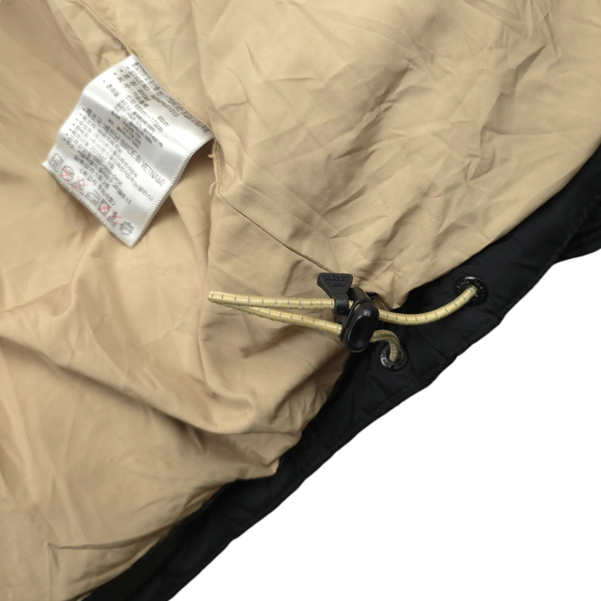 Has a cinch cord on the hood and the waist.